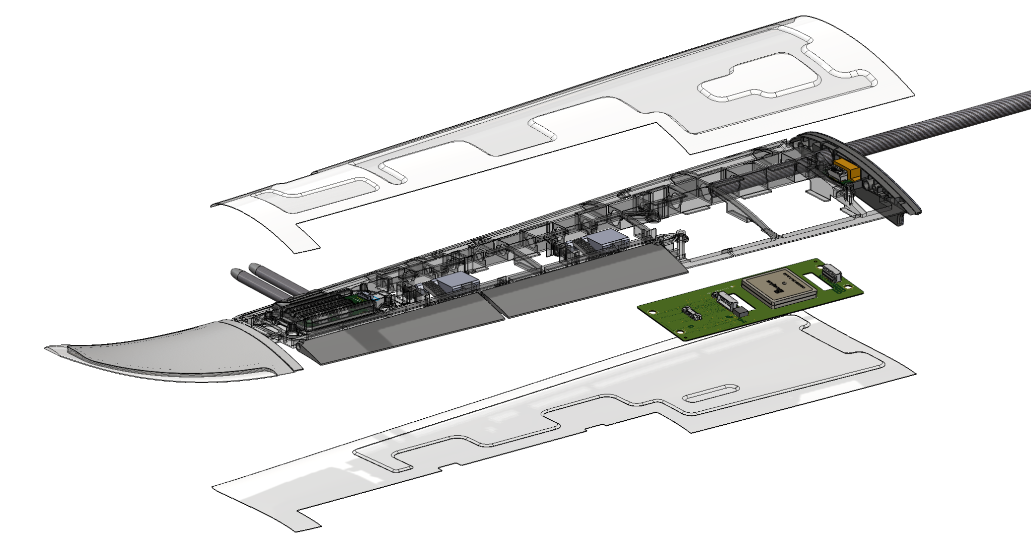 The wing internal structure is one piece for rapid manufacturing. The part must be resin 3D-printed to hit the tolerance and stiffness requirements. The one-piece structure packs all of the product features in a tiny footprint. With 8 seamlessly integrated circuit boads, 2 aileron mechanisms, and a trigger for tool-less removal, the wing is the most complex module on the aircraft.